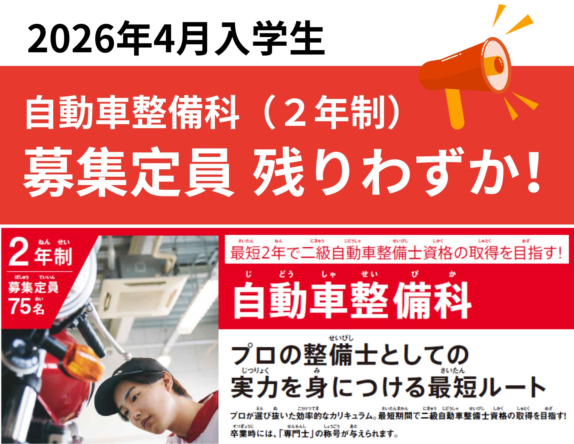 ・自動車整備科(2年制)も第3回入試(10/24金曜日)で応募終了をする予定です。自動車整備科(2年制)への出願を検討されている方は、第3回入試でご出願ください。