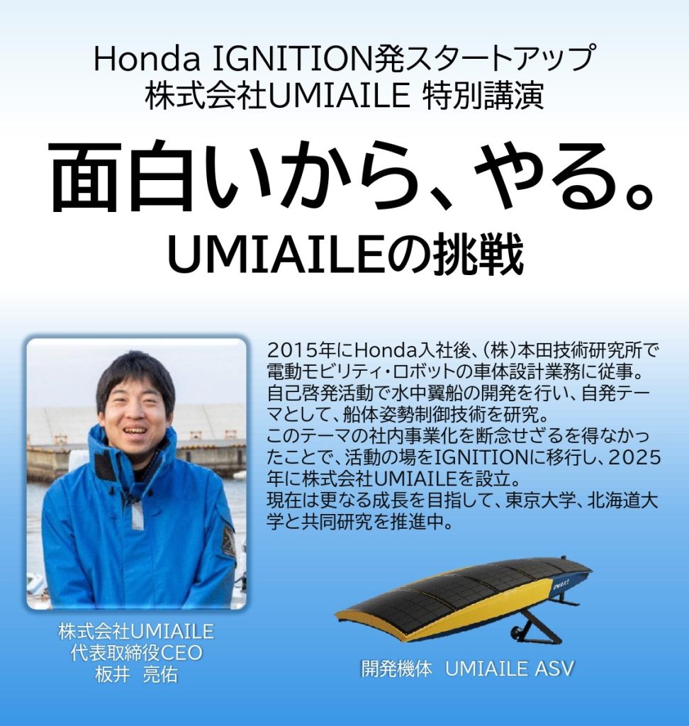 板井氏はHondaに入社後、Hondaの新事業創出プログラム「IGNITION」から『海の見える化』を目指した海洋ドローンの開発、事業化を行う、株式会社UMIAILEを創業しました。