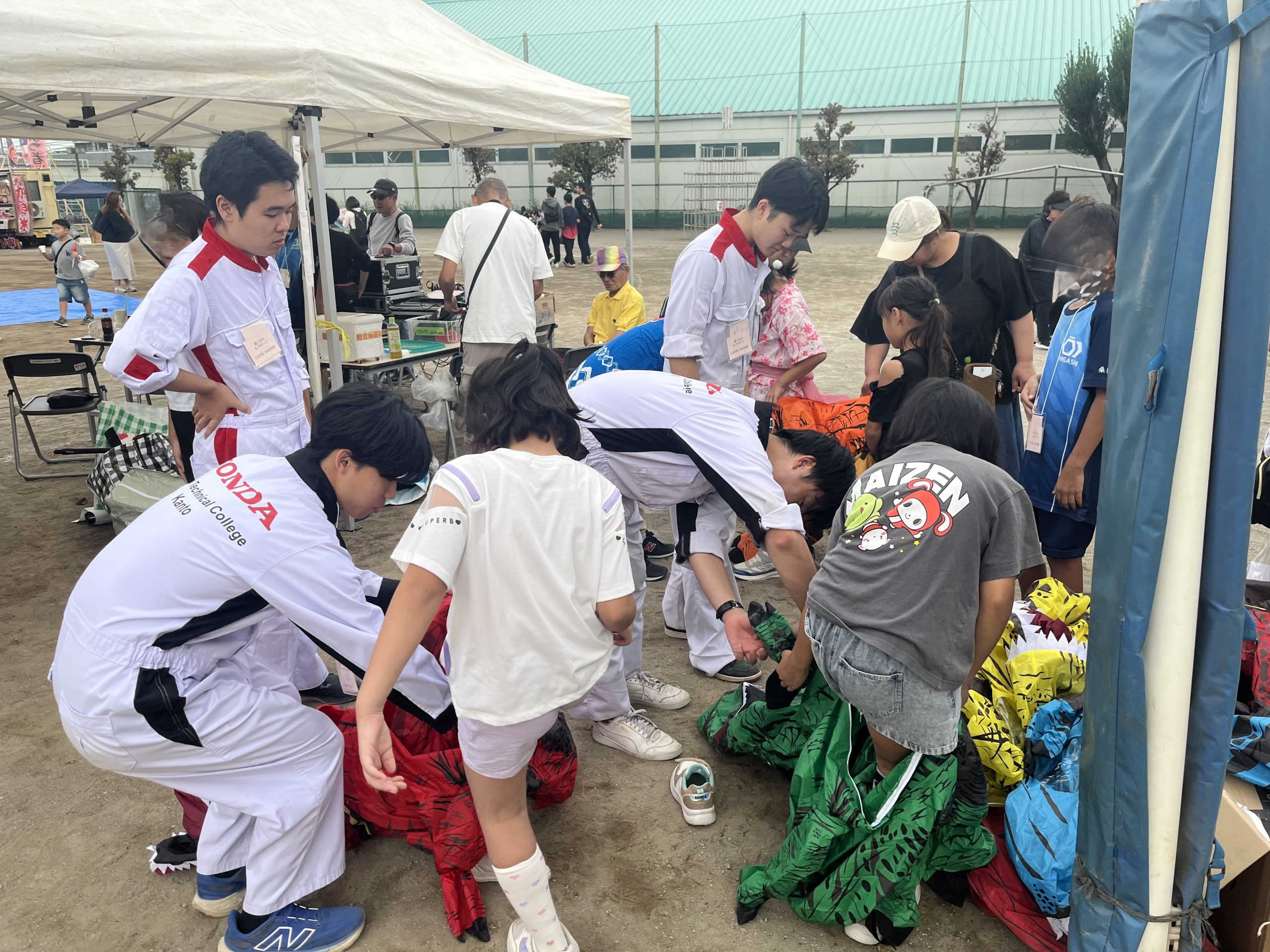 学生は、テントや櫓の設営、水風船やかき氷の屋台、着ぐるみ、エアーボールの監視、サイバーホイールの転がし、