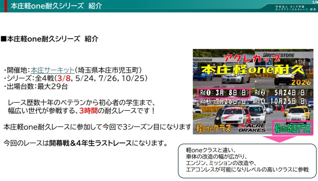 先週末、本庄サーキット(本庄サーキット – 本庄サーキット (honjo-circuit.com))で開催された 『アクレカップ 本庄軽one耐久シリーズ2026 Rd.1』 参戦結果のご連絡をいたします。