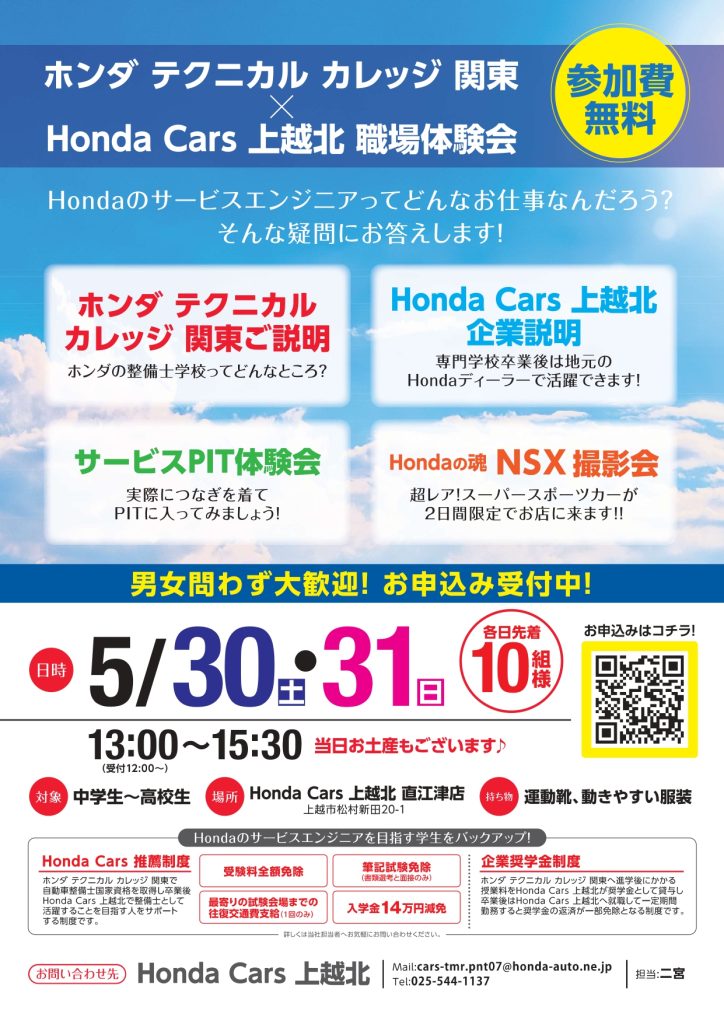 5月30日(土) 31(日) はホンダカーズ上越北 直江津店での職場体験会です。