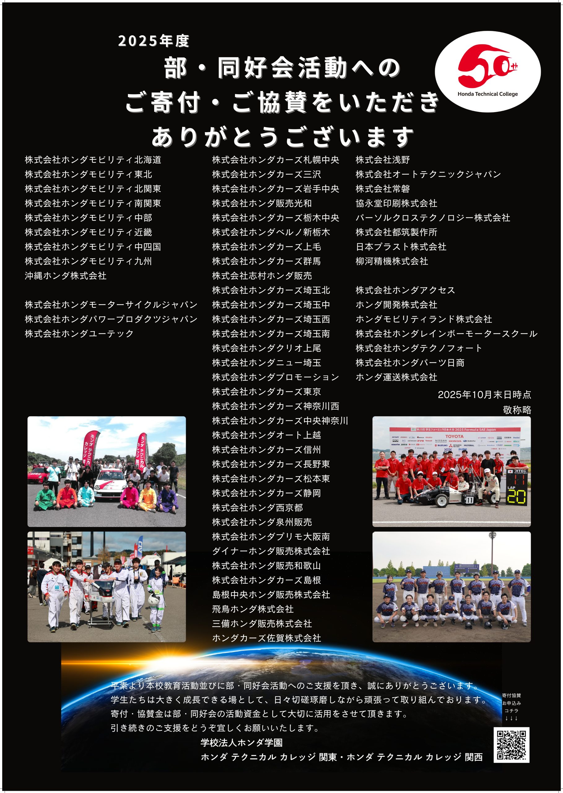 【賛助会企業様】部・同好会活動への寄付・協賛金のお願いについて 2025.10.29 2025年8月に賛助会企業様向けにご案内差し上げた資料となります。 ご寄付・ご協賛につき、ご検討頂けましたら幸いです。 クラブ活動紹介動画(YouTubeチャンネル) 【依頼文】部活動及への寄附・協賛金のお願い2025年8月送付 ホンダ学園宛て寄付・協賛金申込書2025
