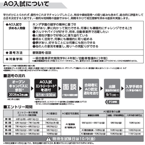 AO入試のエントリーは2026年9月30日までです。AO入試のエントリー条件は2026年2月以降のオープンキャンパス(オンラインも含む)参加が条件となります。 ※留学生の方は上記に加え、JLPT(日本語能力試験)のN1もしくはN2を取得している方となります。 【AO入試のエントリーについて】 学生募集要項2027に付属(P16・17)しております「AO入試エントリーシート」もしくは下記のPDFをダウンロードし、必要事項を記入の上、送付ください。 AO入試エントリーシートは下記をクリックするとPDFがダウンロードできます AO入試エントリーシート2027(表) AO入試エントリーシート2027(裏) <エントリー用紙送付先> 〒589-0012 大阪府大阪狭山市東くみの木二1937-1 ホンダテクニカルカレッジ関西 AO入試担当者 宛 エントリー期間:2026年6月1日(月) ~ 2026年9月30日(水)まで