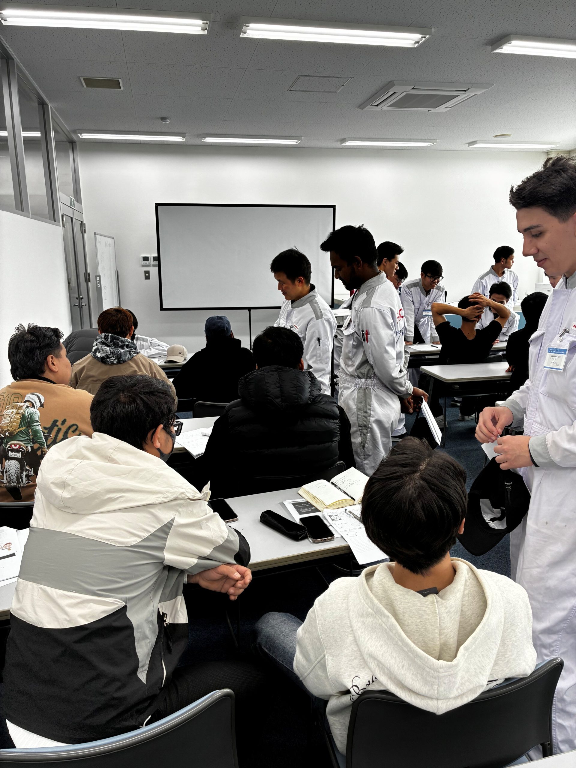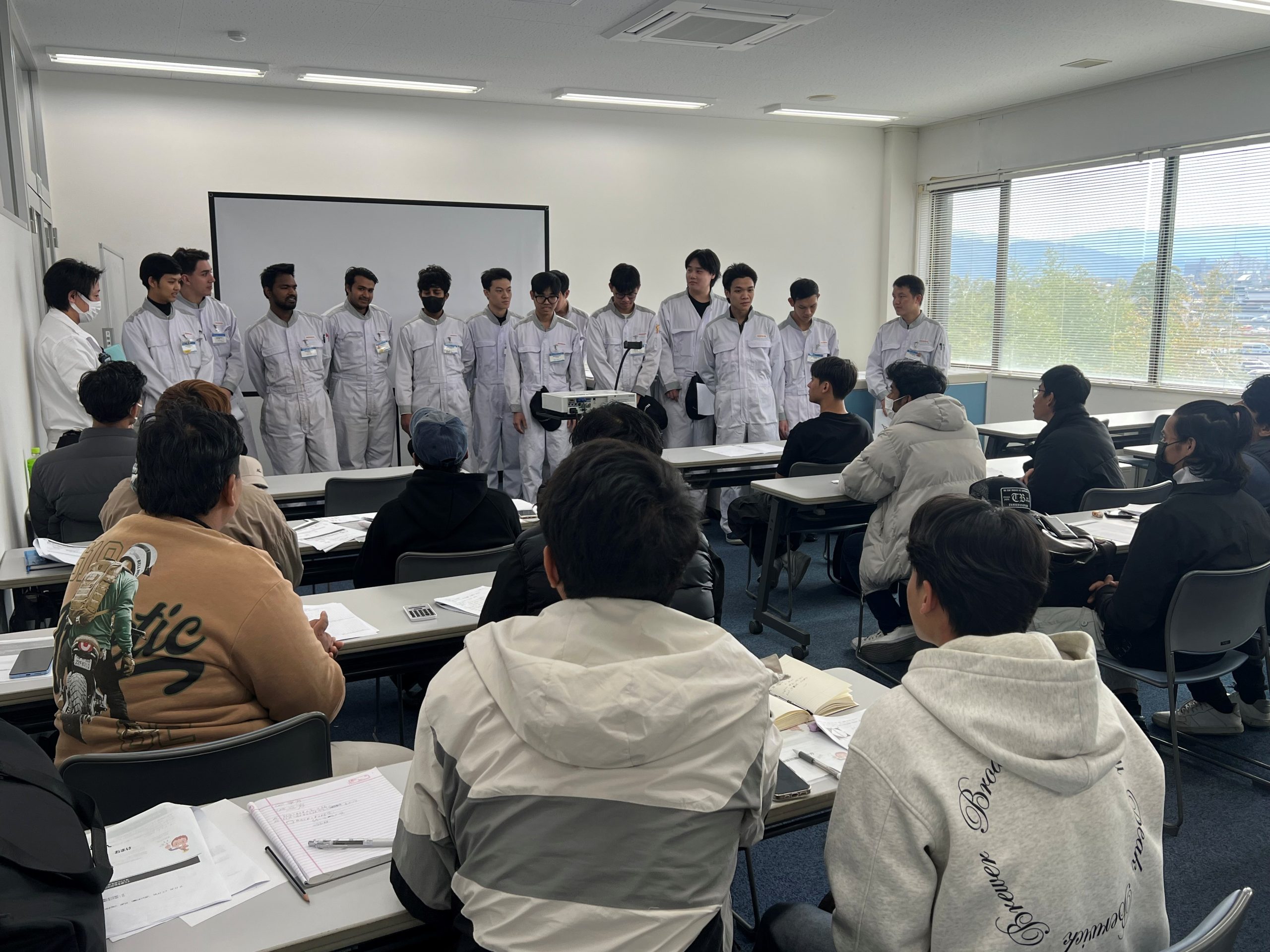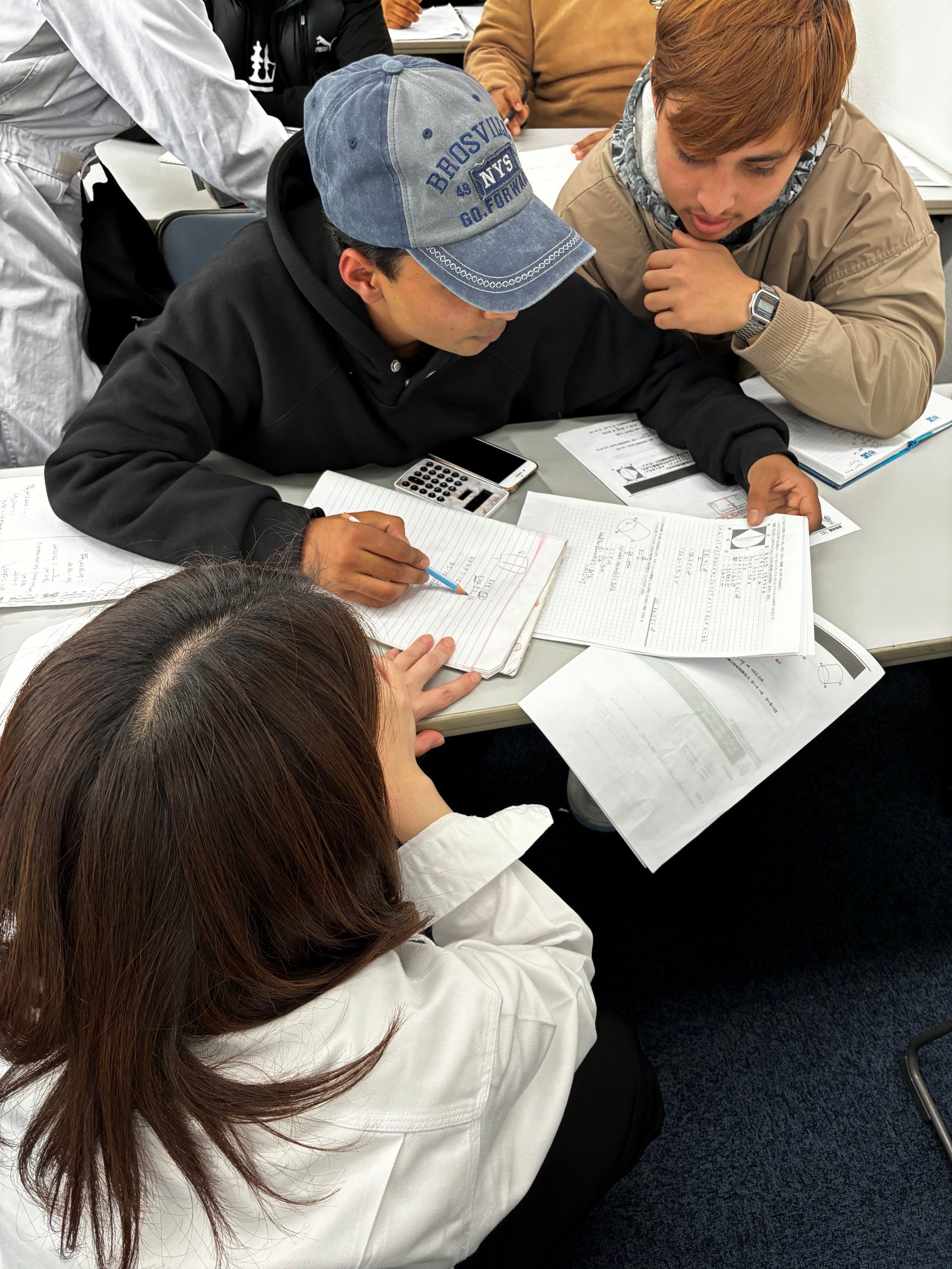 日本で自動車の知識・技術を身に付けるには、数学の基礎に日本の特有の表現・単位等を習得しなければなりません。今回は、留学生一人ひとりの数学の基礎学力を確かめることと同時に問題のどこで躓いているのかを把握したうえで、個別対応で数学力の向上を図りました。また、今回の勉強会で入学前に留学生同士で交流や教えあいができたことも大変良い機会になりました。