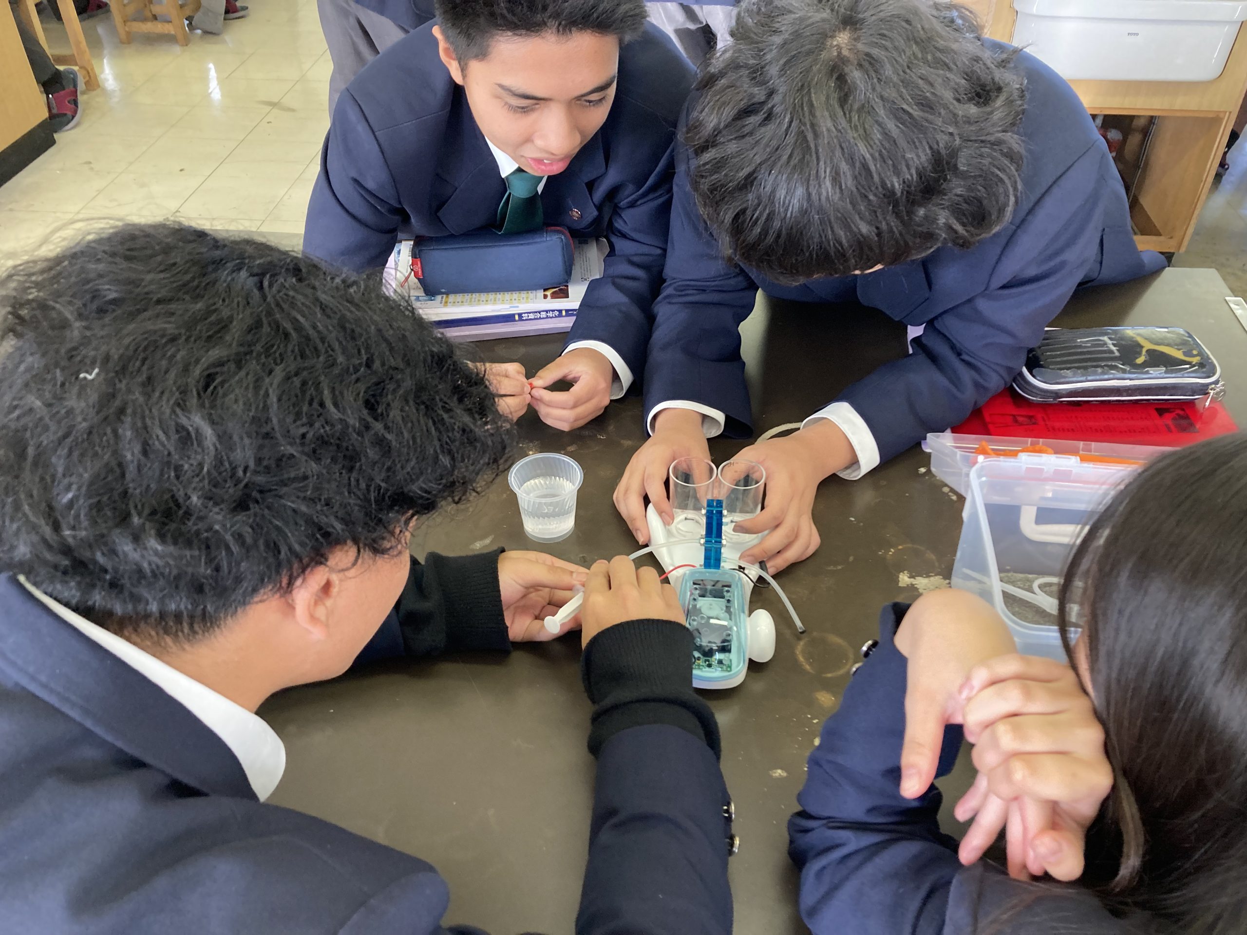 ちょうど高校の授業で元素記号・原子・分子や水素のことを学んでいる最中だったので、実際に教室で水素を取り出し、酸素と結合させ電気を作り、その電気で模型のクルマを動かしてみる体験授業は多くの生徒様に楽しんでいただけました。