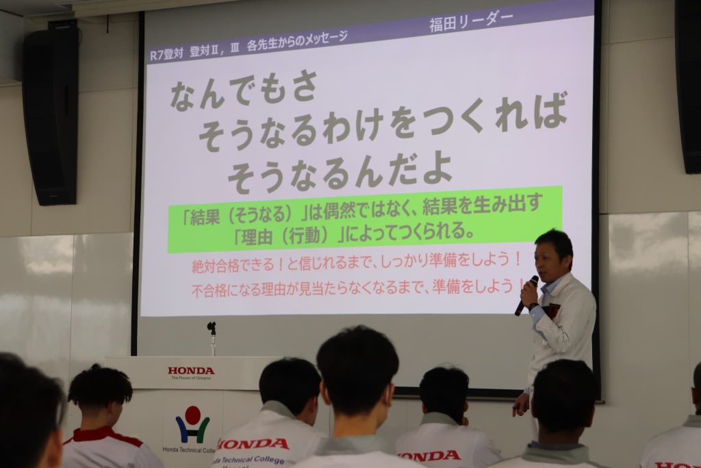 2月26日(木)に3月22日(日)に行われる二級自動車整備士の筆記試験、全員受験・全員合格に向けての決起大会を実施しました。試験まで残り1ケ月をきり、いよいよ最終追い込み期間となりました。決起大会には、自動車整備科2年生・自動車整備留学生科3年生・一級自動車研究開発学科2年生が参加し、校長先生や教員から、激励・応援メッセージをいただきました。