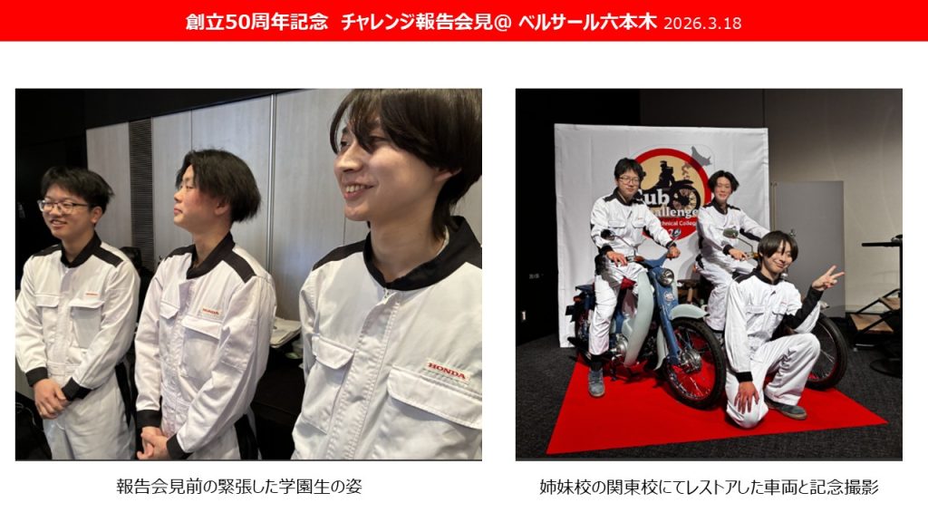関東校と関西校でそれぞれ初代Cubをレストアし、西日本は関西校、東日本を関東校のレストアした初代Cubが2026年4月より各地を走ります。Cub主の皆様、学園OBの皆様、お世話になっている販売会社様、ぜひ、初代Cubの雄姿を見かけましたらお声がけください。