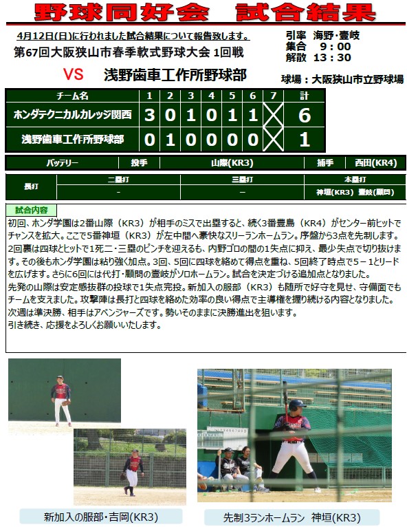 【部同好会】大阪狭山市春季軟式野球大会1回戦! 2026.04.15 4月12日(日)大阪狭山市野球場で「第67回 大阪狭山市春季軟式野球大会」の1回戦に出場したホンダ テクニカル カレッジ 関西 野球同好会が見事勝利し、準決勝に駒を進めました。応援に来ていただいた皆様、大きなご声援ありがとうございました。 また、日頃より本校の部同好会活動にサポートをいただいている皆様、感謝申し上げます。 次回の準決勝は、4月19日(日)9:20に大阪狭山市野球場にてアベンジャーズと対戦予定です。応援、よろしくお願いします。