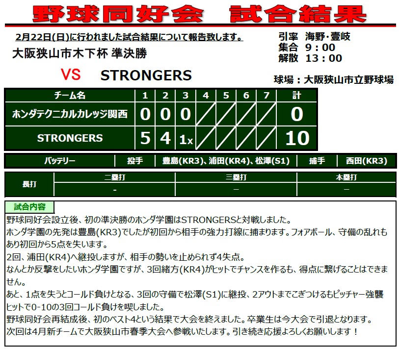 2月22日(日)に野球同好会が、大阪狭山市立野球場で行われた大阪狭山市木下杯の準決勝に臨みました。野球同好会の再発足後、初めての準決勝進出とあり少し緊張気味の学園生もいました。試合は、0対10の3回コールド負けとなり、決勝には残念ながら進むことができませんでした。次年度は、決勝進出・優勝目指し、新チーム体制となる後輩の学園生が雪辱を果たしてくれることを期待しております。