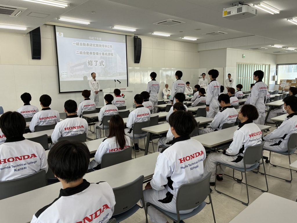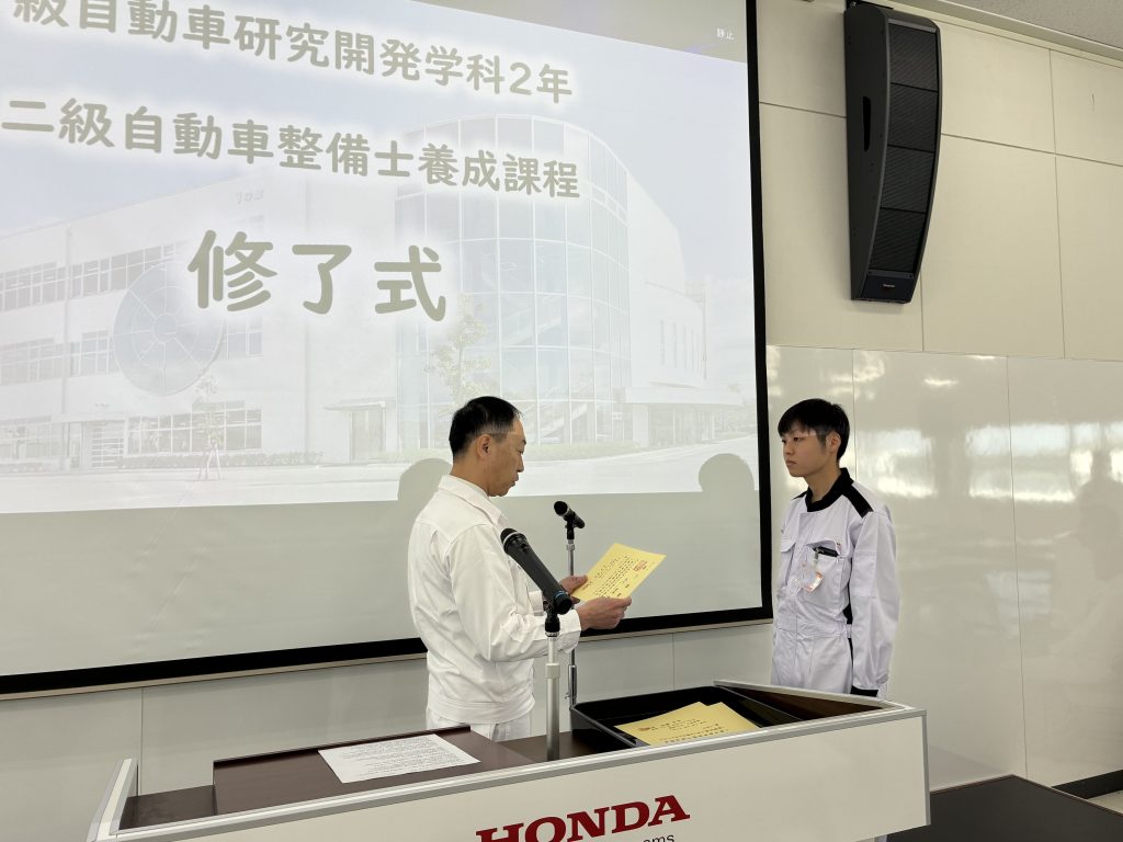 3月12日(木)に一級自動車研究開発学科2年生(二級課程)と自動車整備留学生科1年生(三級課程)の修了式および在校生の令和7年度後期終業式を実施しました。終業式では異動および退職される先生からのご挨拶と善行表彰および春休み期間の生活と交通安全等の指導を行いました。