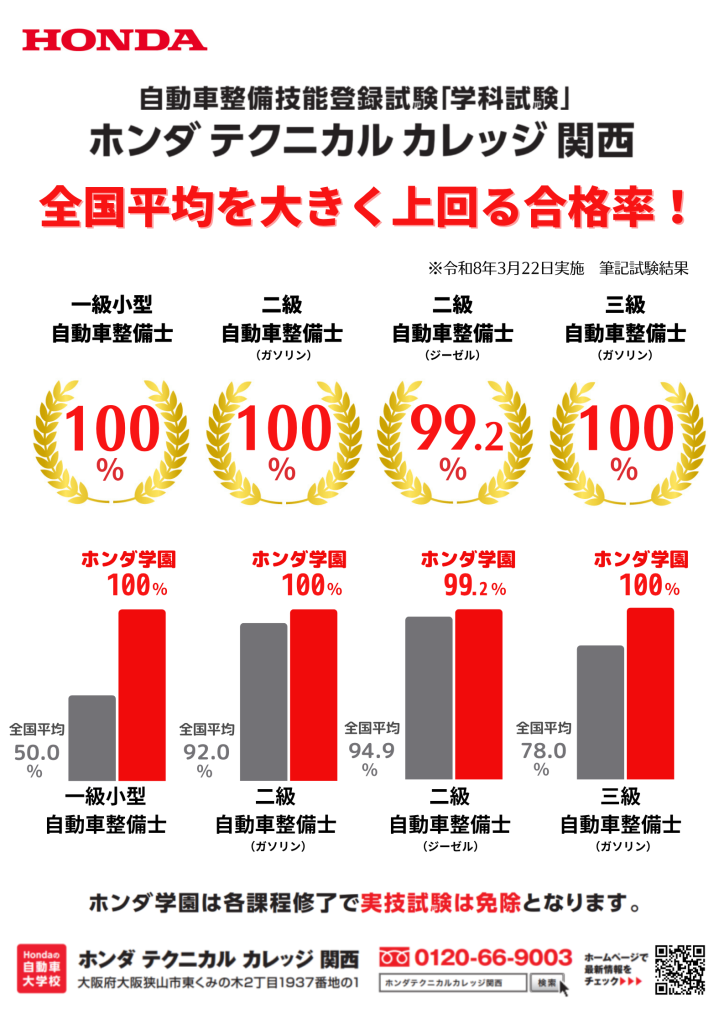 ◆令和8年3月22日(日)自動車整備技能登録試験の『ホンダ テクニカル カレッジ 関西』受講者と合格者
