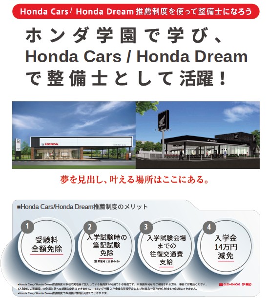『Honda Cars / Honda Dream 推薦』で本校にご入学される方には、4つの特典『①受験料2万円免除 ➁入試時の筆記試験免除 ➂入試時の往復交通費の支給 ④入学金14万円減免』+企業奨学金※(企業による無利子貸与型奨学金)が受けることができます。