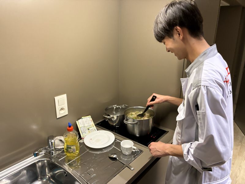 また、学生たちは食費を節約するために本日より自炊をしております。初日から気合が入り、見事な出来栄えの夕飯となりました。